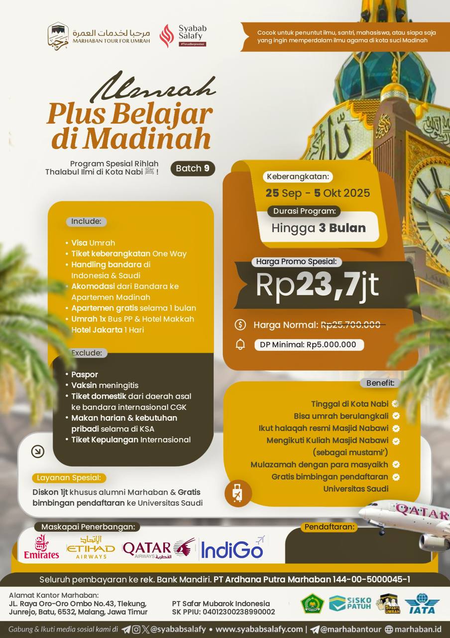 | 25 Sep – 5 Okt 2025 | Umrah + Belajar Batch 9 | Hingga 3 Bulan | Tersedia | Booking |
